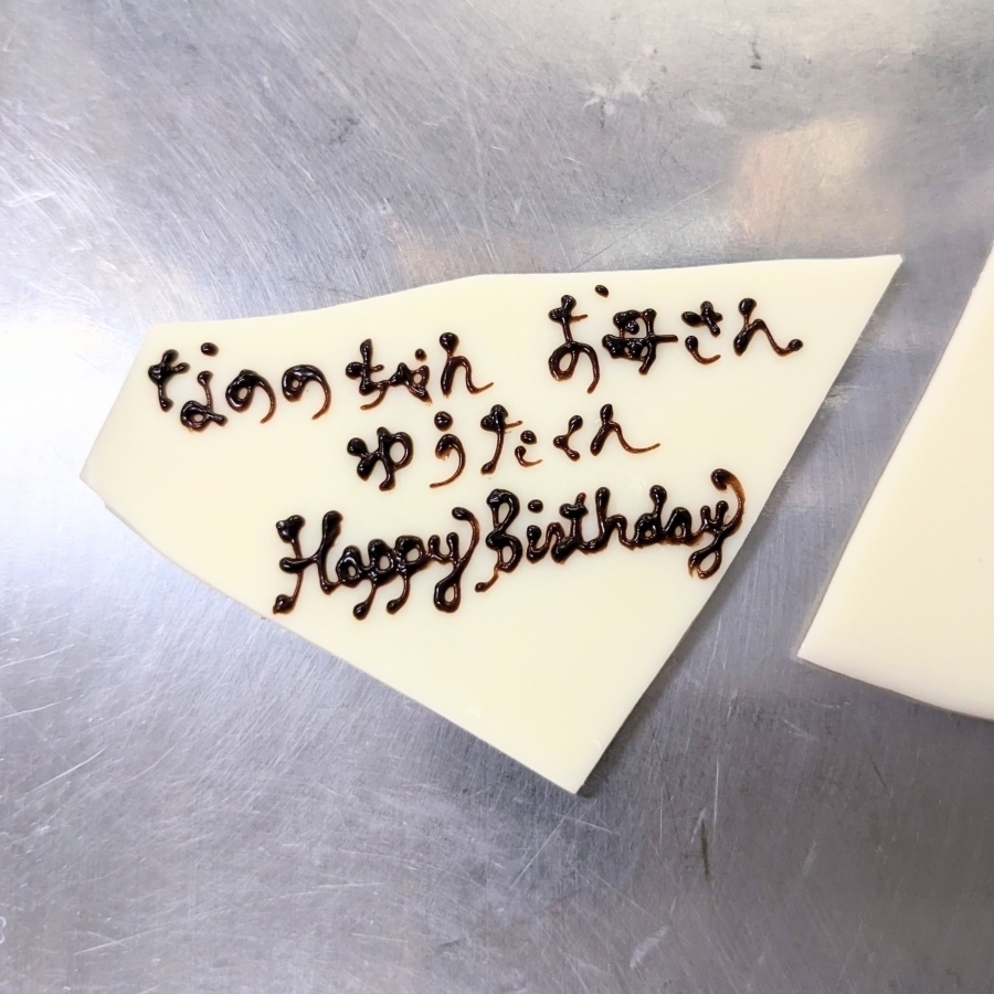 メッセージプレートは、溶かして薄く広げたホワイトショコレートをランダムに割って、職人がチョコレートのペンで手書きします。