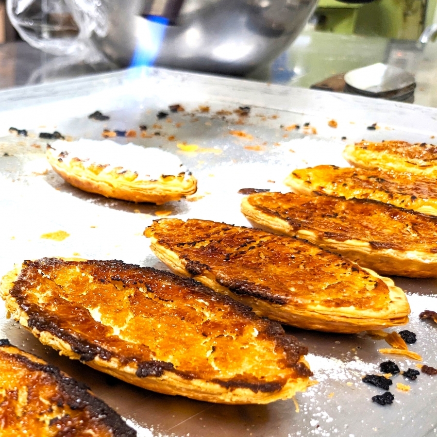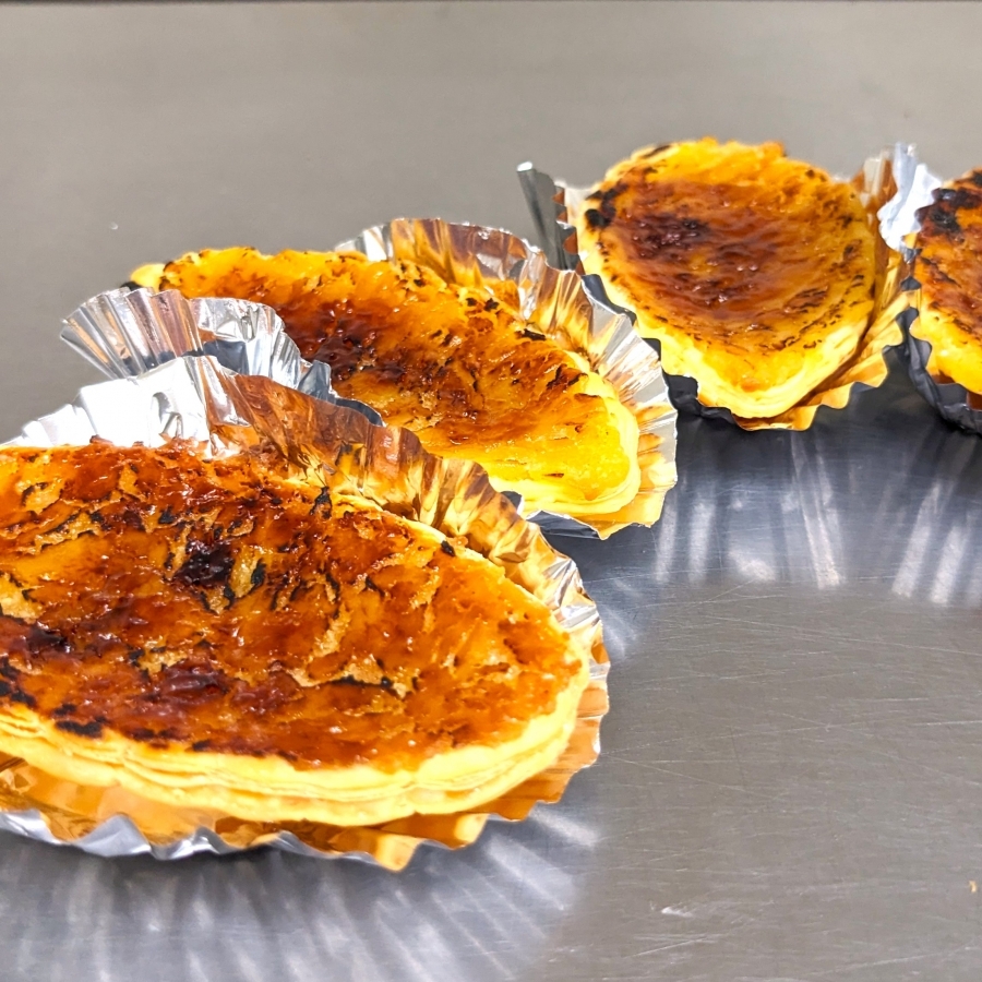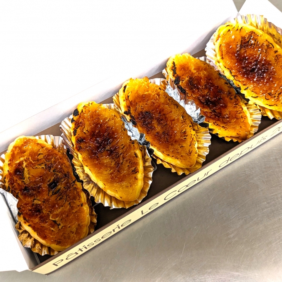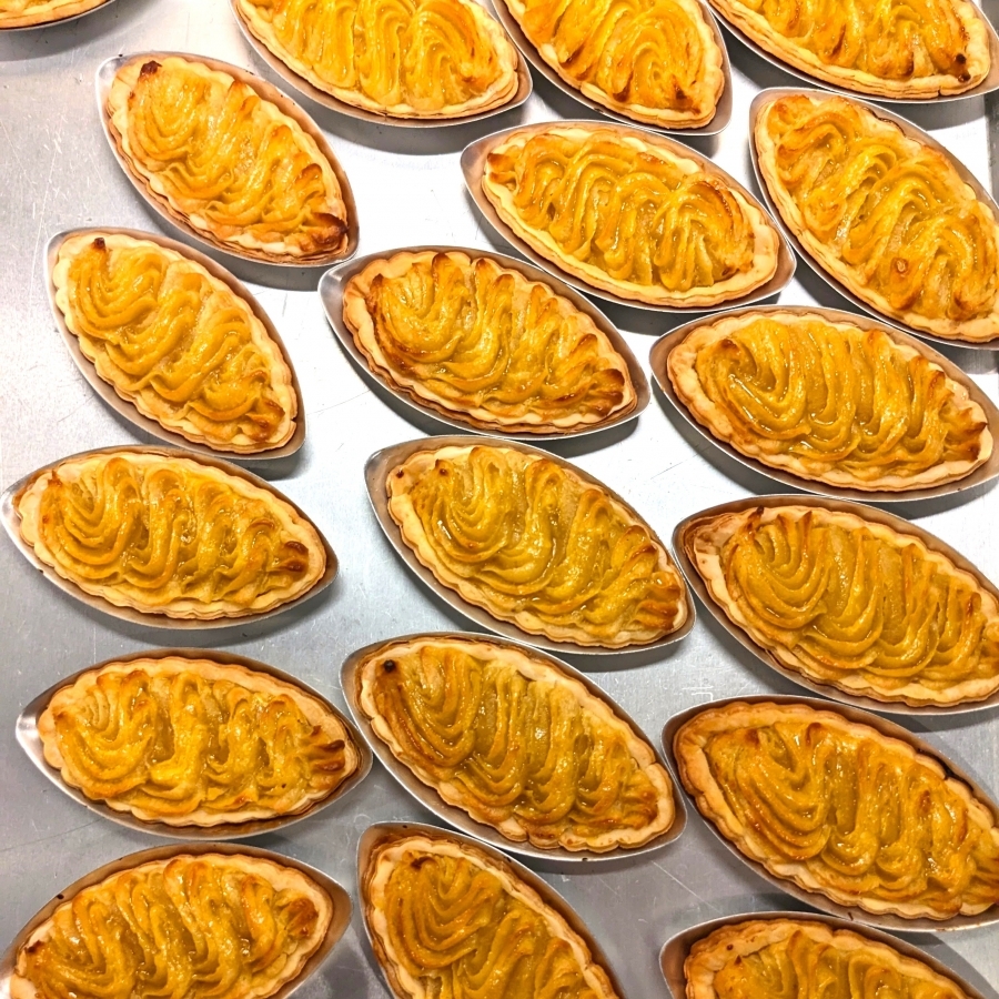 金沢のサツマイモ、五郎島金時芋を主役に安納芋を練り入れた、まさに芋の美味しさを打ち出したスイートポテトです。白餡を加えて上品な甘さを添え、卵のコクと、バターと生クリームの濃い乳味を練り入れた芋餡を、銅鍋に入れて、強火で一気に炊き上げます。熱電動の高い銅鍋で、水分を飛ばしながら炊くことで、やがてねっとり濃密に甘みを増した芋餡は、職人が一つ一つパイ生地の上に手絞りします。ここから、高温のオーブンで、パイ生地からサクッと芳ばしさが溢れ出すまで焼き上げて完成。ル・クールの「おいもさん」は、いくつもの工程を経て、こっぼこぼ(金沢弁で甘くてほくほくしたという意味)な美味しさに辿り着きました。
