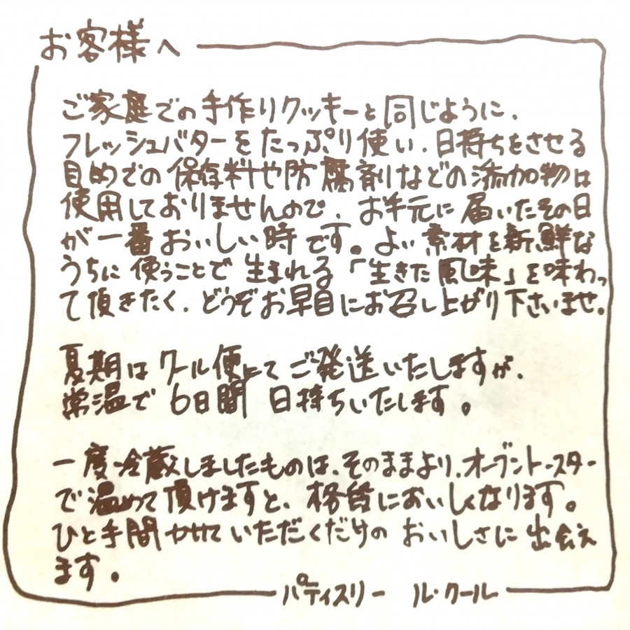 たっぷりの発酵バターの旨味は、焼き上がった後も持続します。この美味しさを召し上がっていただくために、直射日光、高温多湿を避けて冷暗所で保管をお願いいたします。