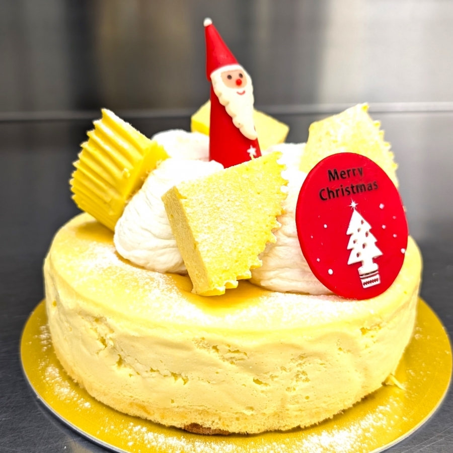 上に生クリームを絞り、チョコレート製のサンタとプレートをのせて、その周りに黄金テリーヌを盛ってデコレーションしております。デコレーションを含めた高さは12cm。