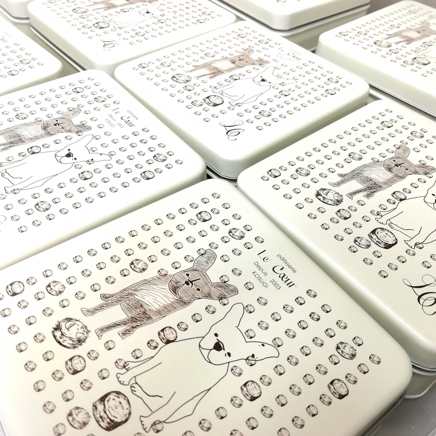 缶のサイズは、15cm角。フレンチブルドッグのイラストが入った白色です。