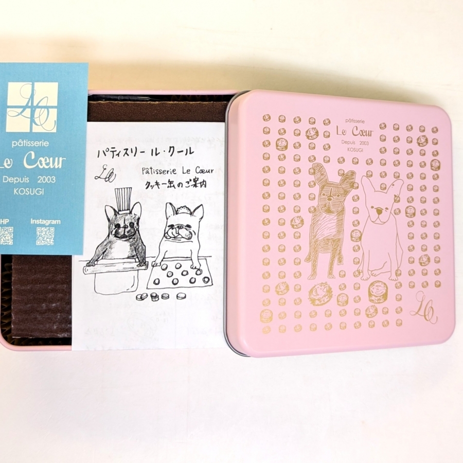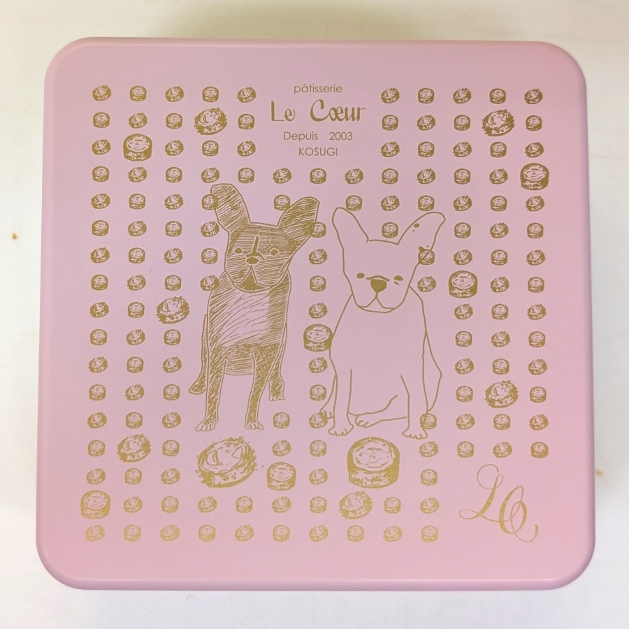 缶のサイズは、15cm角。フレンチブルドッグのイラストが入ったピンク色です。