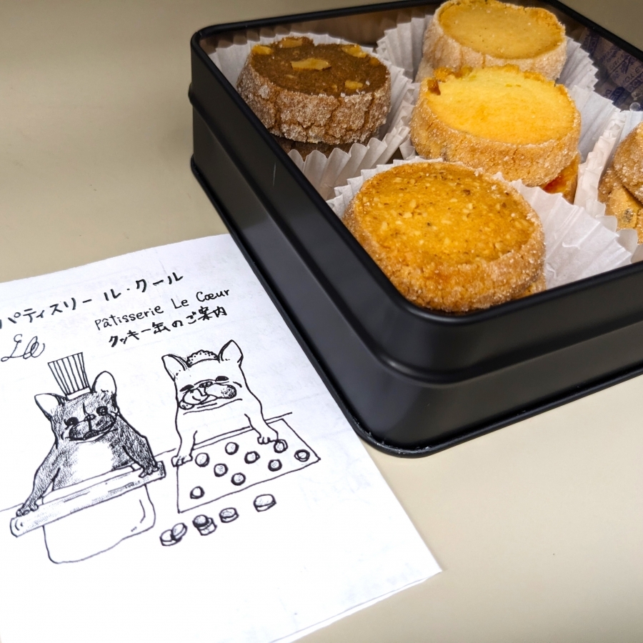 缶のサイズは、15cm角。フレンチブルドッグのイラストが入った白色です。