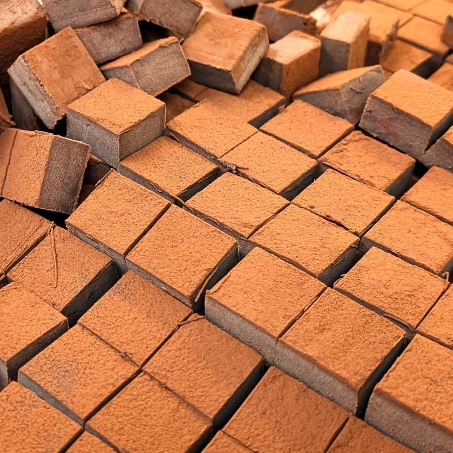 カカオ35%以上、カカオバターを35%以上含むという国際規格を通ったクーベルチュールチョコレートのみを使用し、そこに乳風味濃厚な生クリームを注ぎ、パティシエの手によって丁寧に時間をかけて練り込む製法に徹しております。