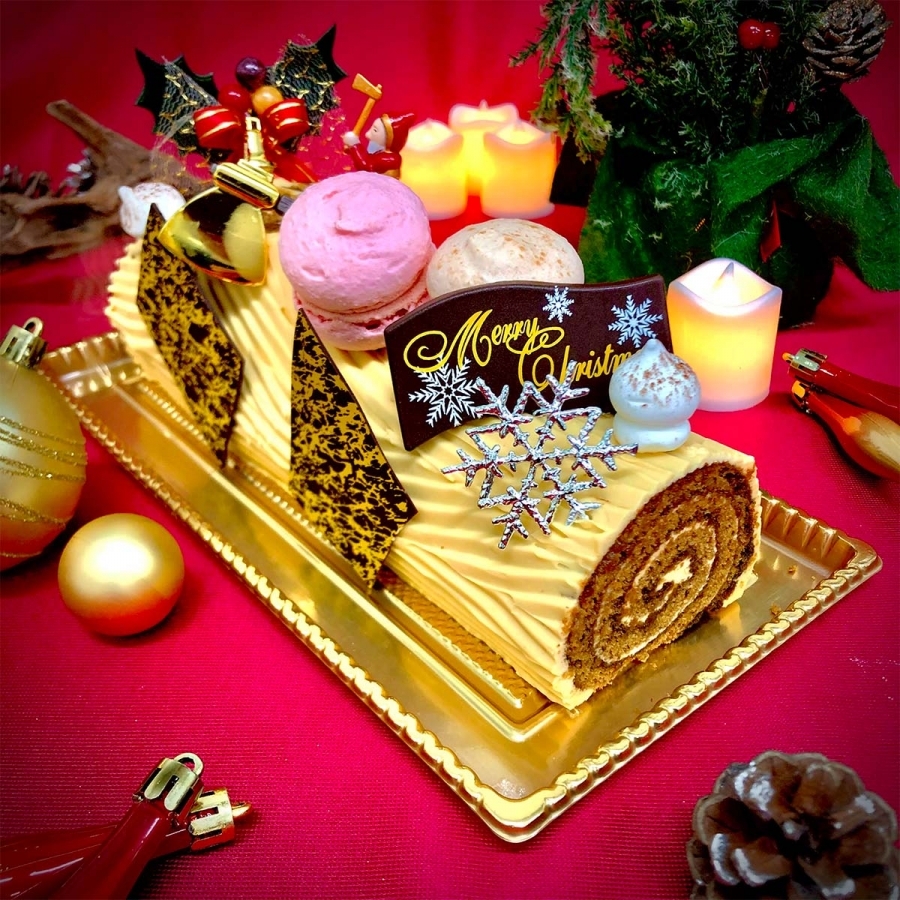 バター100%のキャラメルバタークリームと、コーヒーシロップを染み込ませた生地で作る、クラシックなブッシュドノエルです。
