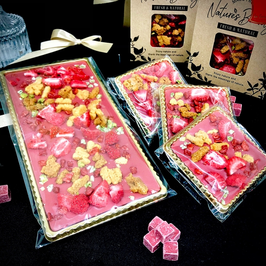 苺味のチョコレートにフリーズドライ苺、苺クリスピーなどをのせました。