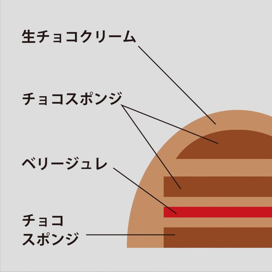 ベリーのジュレをサンドした生チョコレートのクリームをまとった、ドーム型ショートケーキ
