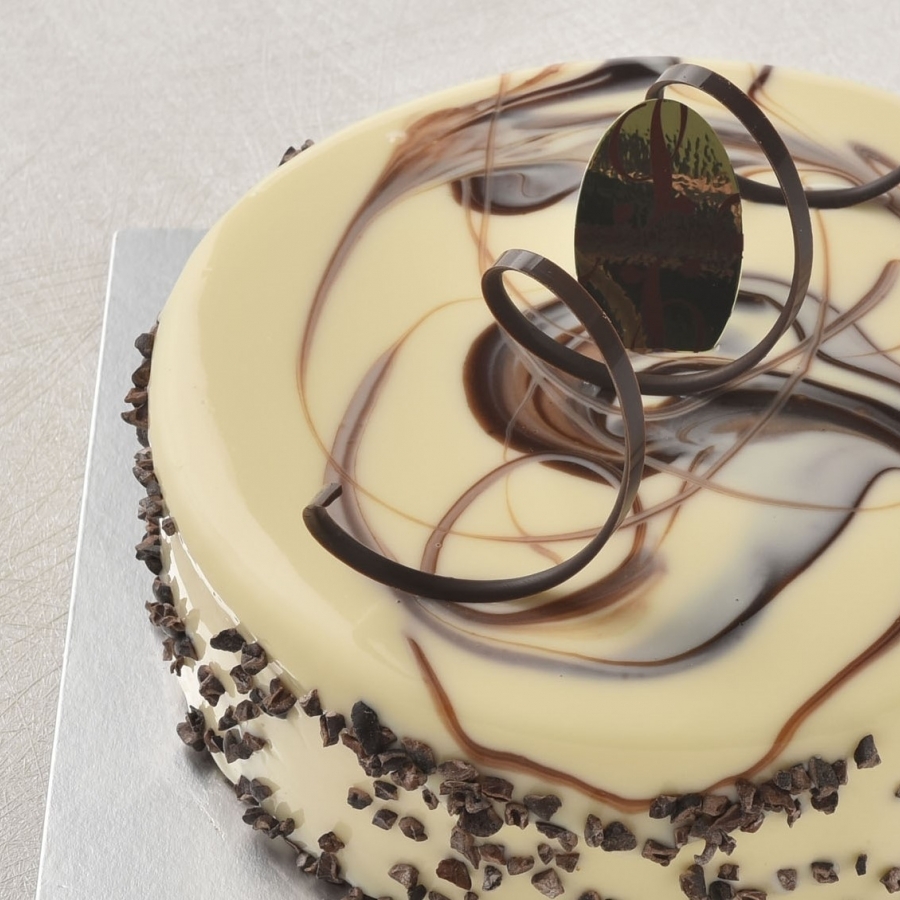 ミルクチョコのスフレの上に、ビターチョコのムースとホワイトチョコのムースを重ねました。