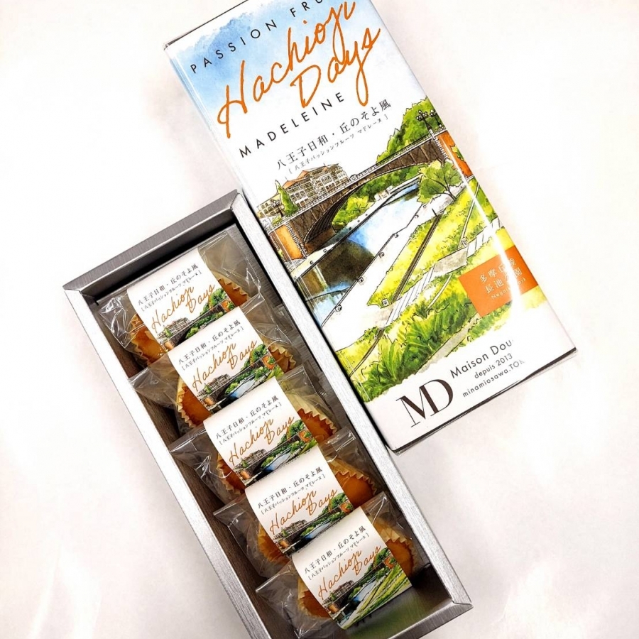 しっとりと、そしてほどけるような食感のライム風味のマドレーヌ生地に程よい酸味の八王子産パッションフルーツのコンフィチュールとパッションのグラス(糖衣掛け)。