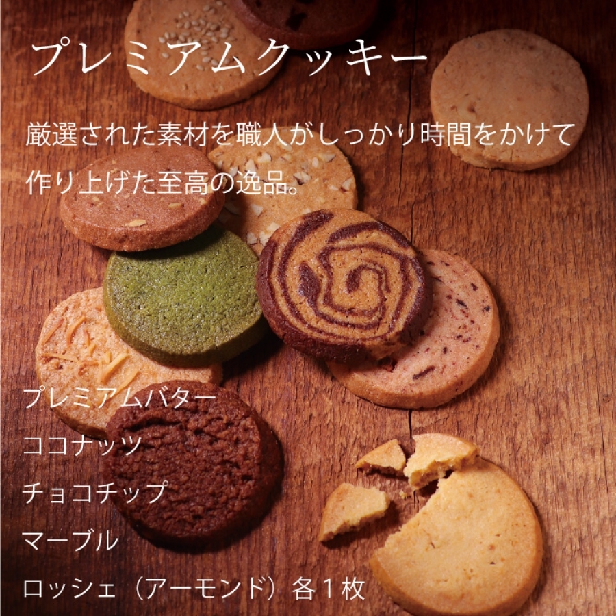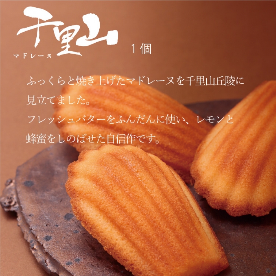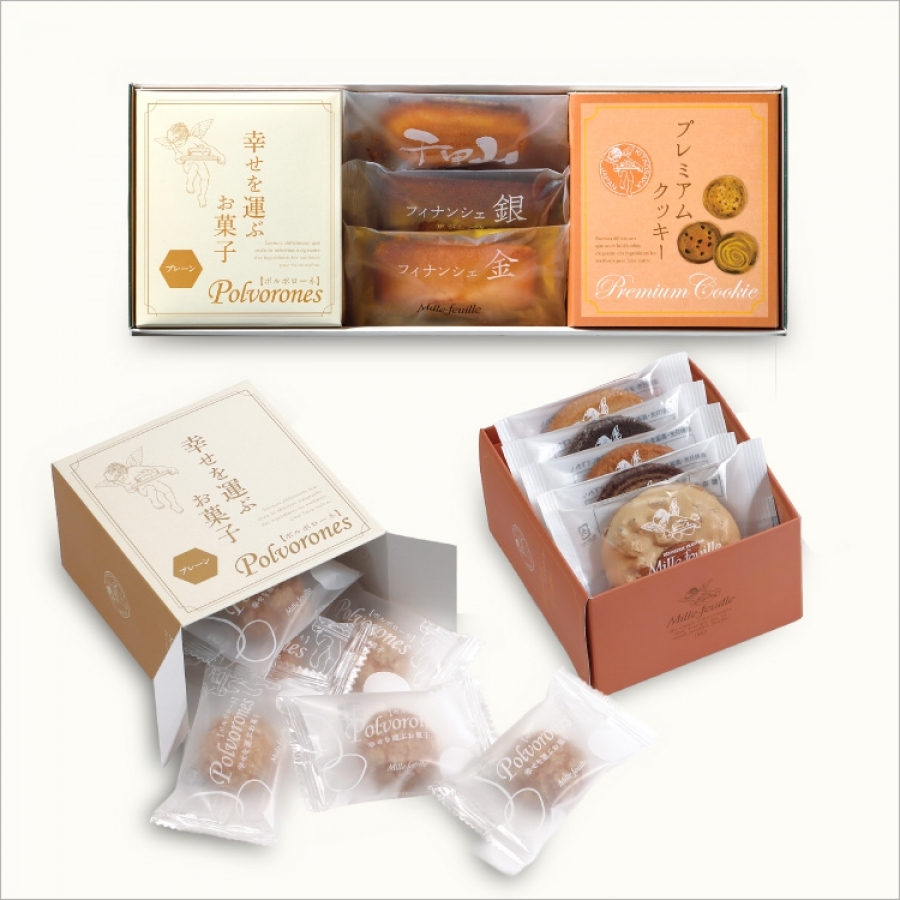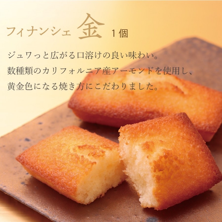 | 内容量 | フィナンシェ金 1個 フィナシェ銀 1個 千里山マドレーヌ 1個 ポルポローネ(プレーン)8個入 1箱 プレミアムクッキー5枚入ーA 1箱 |