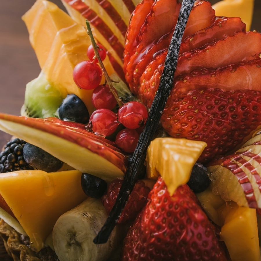苺、りんご、キウイ、ぶどう、バナナ、柑橘、ベリー……ひとつひとつ丁寧にカットし、バランスよく飾られた果実たちが、まるで花束のように咲き誇る、贅沢な一台です。