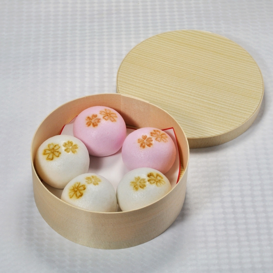桜花爛漫の雰囲気を上用万寿に桜の焼印で表し2色の薯蕷餡にしました。