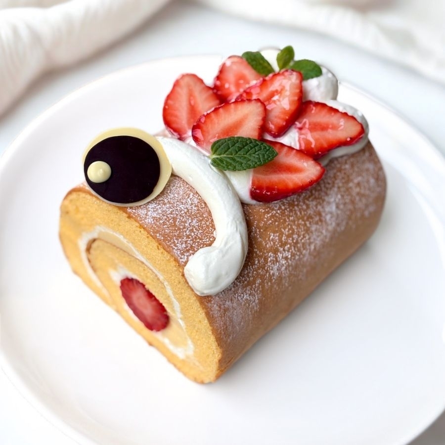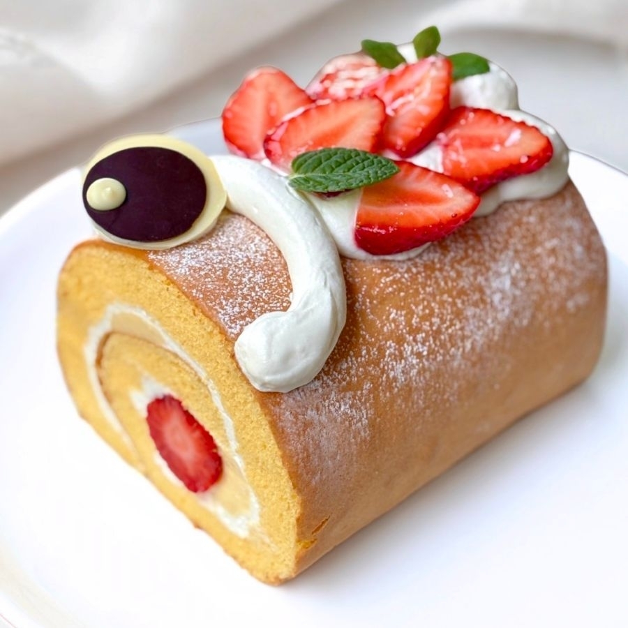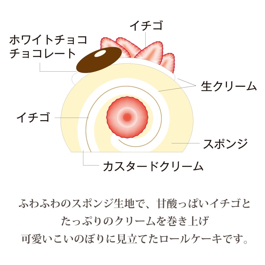 ふわふわのスポンジ生地で、甘酸っぱい苺とたっぷりのクリームを巻き上げました。
