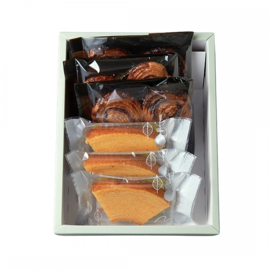 卵とメープルの風味が豊かなカットバウムと、シナモンが香るサクサクのパルミエをアソートにしました。