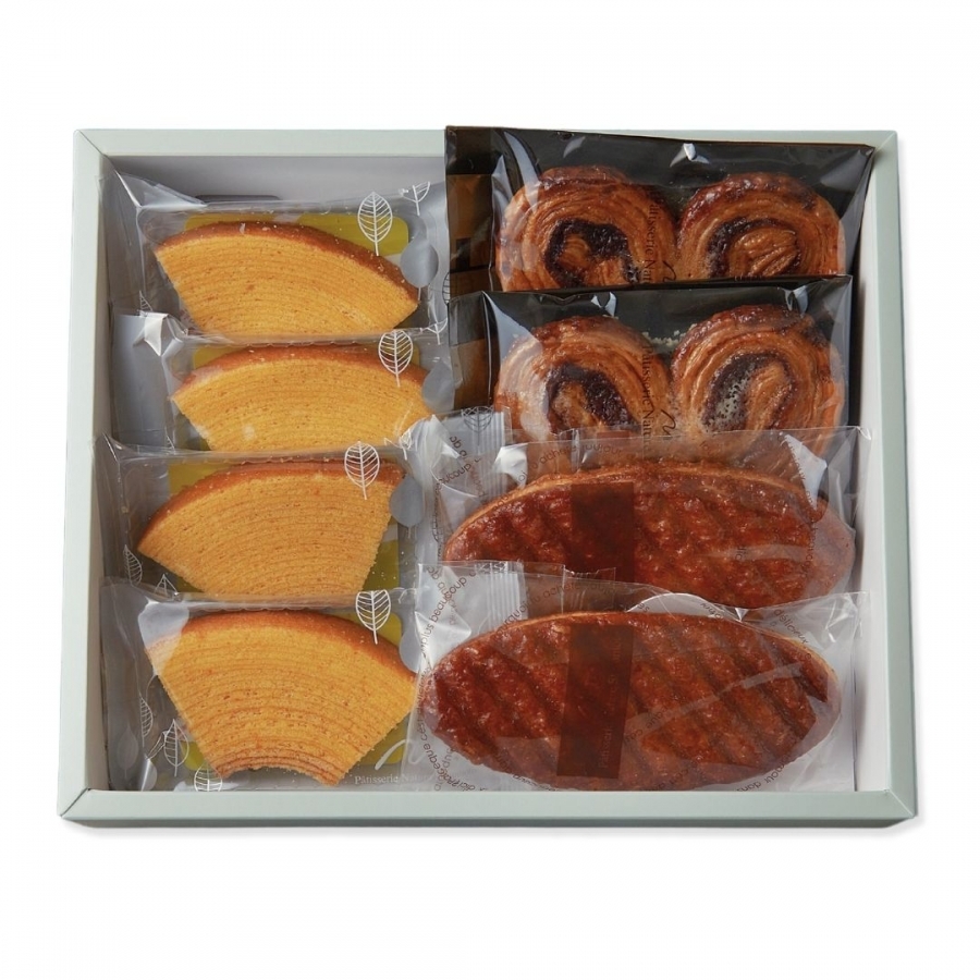 卵とメープルの風味が豊かなカットバウムと、サクサク香ばしいリーフパイ、シナモンが香るパルミエをアソートにしました。