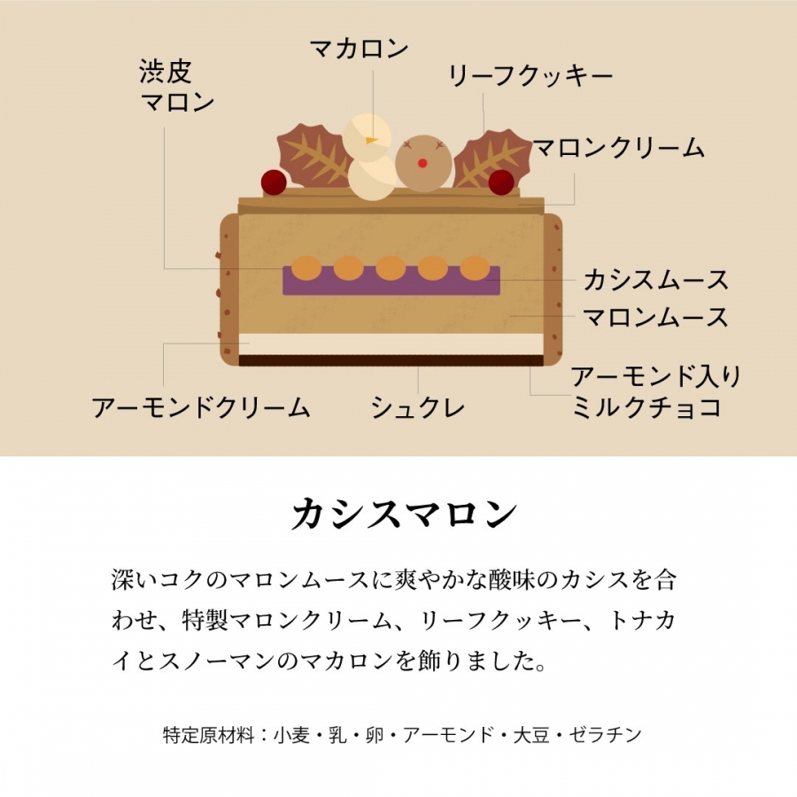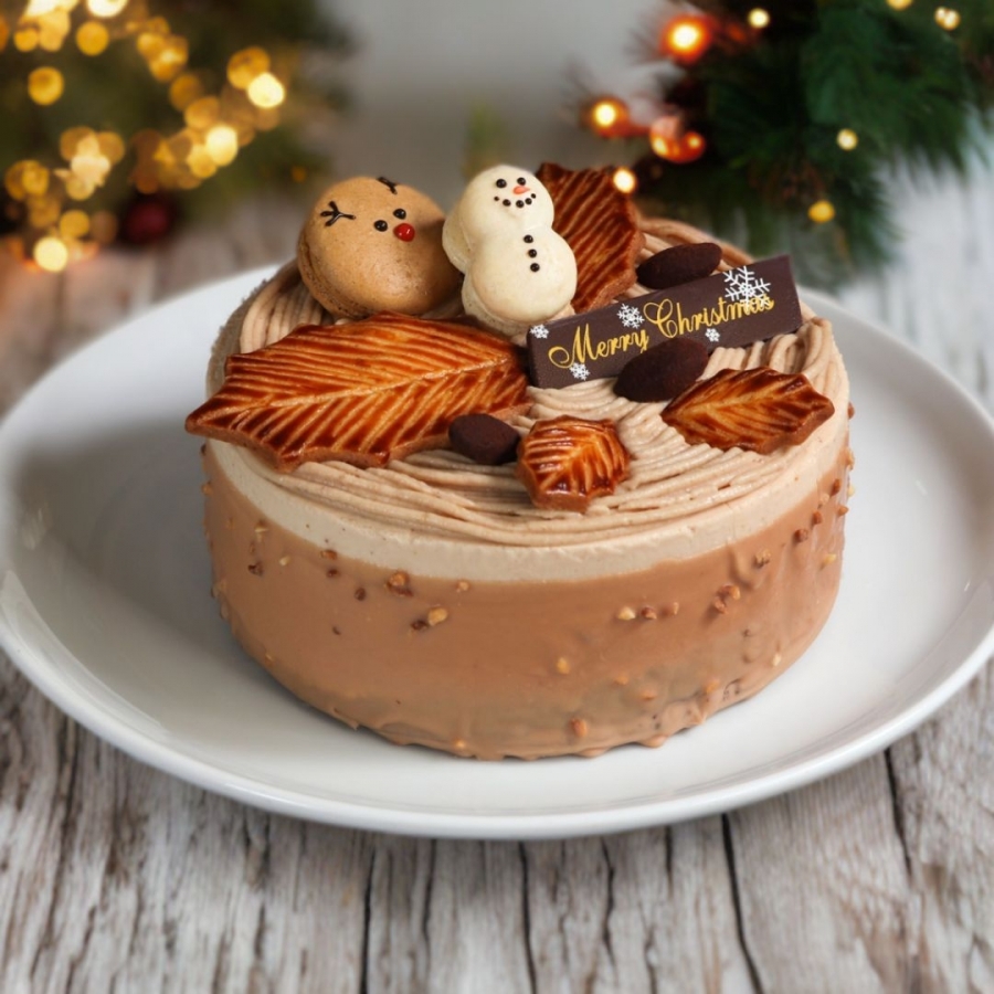 深いコクのマロンムースに爽やかな酸味のカシスを合わせ、特製マロンクリーム、リーフクッキー、可愛らしいトナカイとスノーマンのマカロンでデコレーションしました。