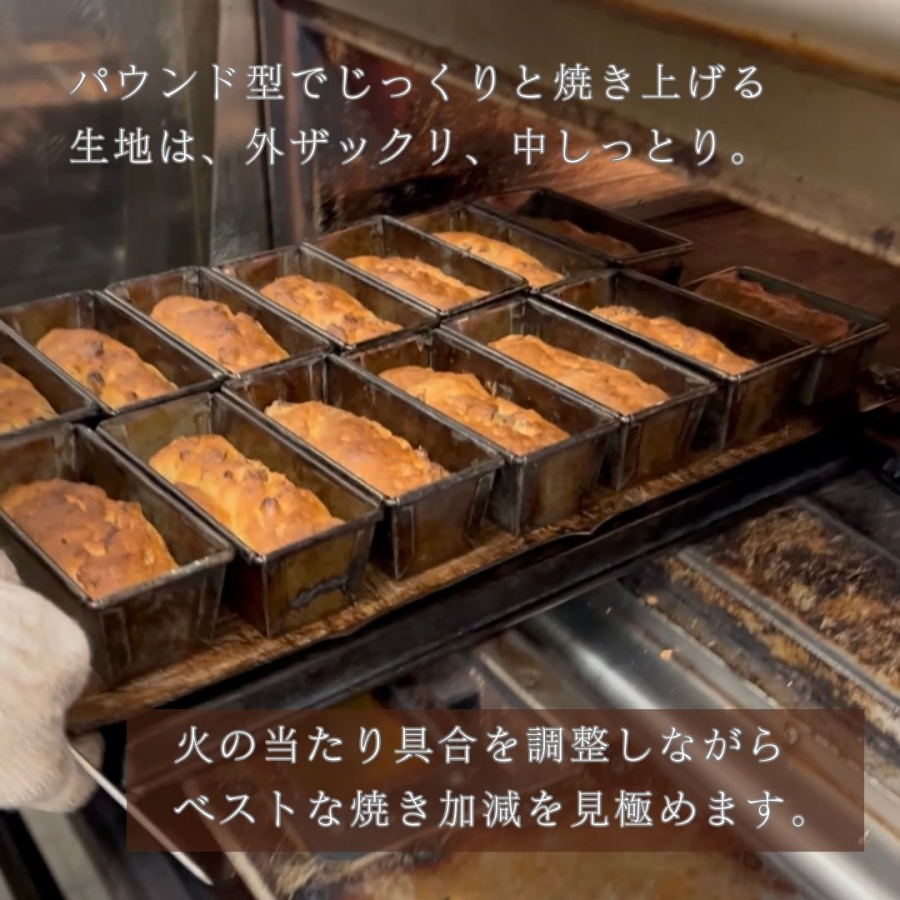 薄力粉と強力粉をバランスよくブレンドし、パウンド型で焼き上げた生地は、外側ザックリ、中はしっとり。