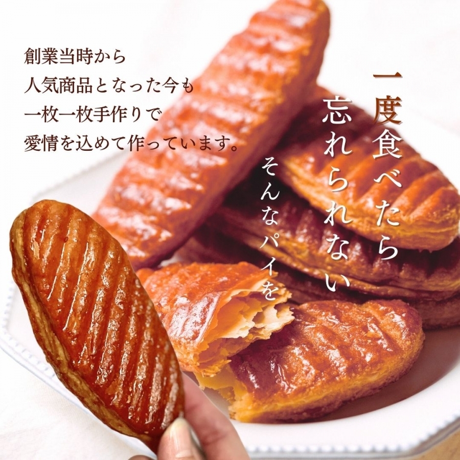芳醇なバターの香りと、ほろ苦いカラメル、サクサクの食感が心地良い当店自慢のパイ菓子です。