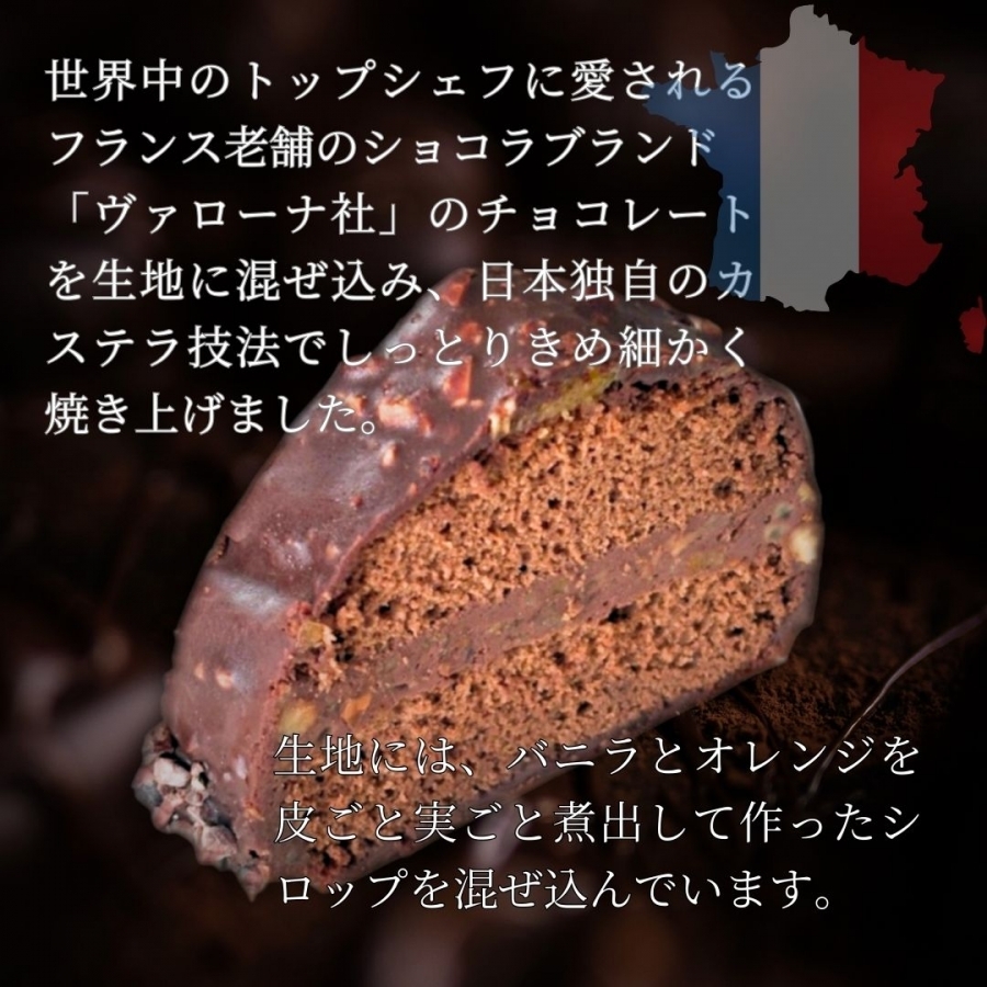 世界中のパティシエ、ショコラティエから絶大な支持を得るフランスの老舗ショコラブランド「ヴァローナ社」のチョコレートを使った生地を、日本独自のカステラ技法で焼き上げた新感覚のパウンドケーキです。
