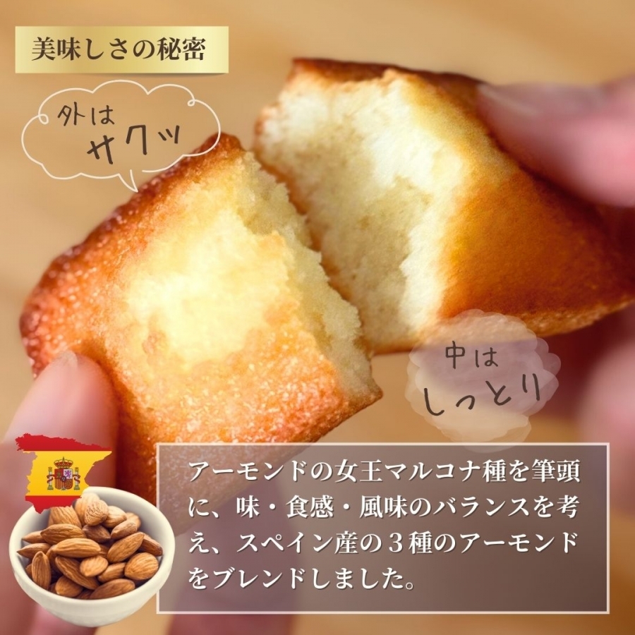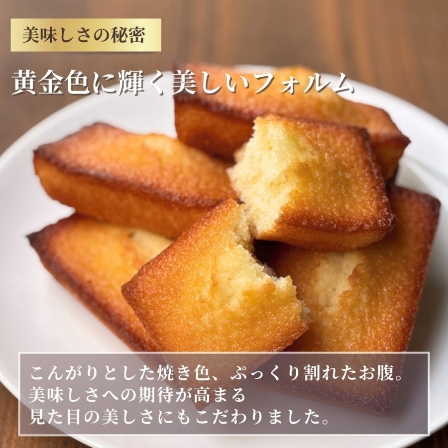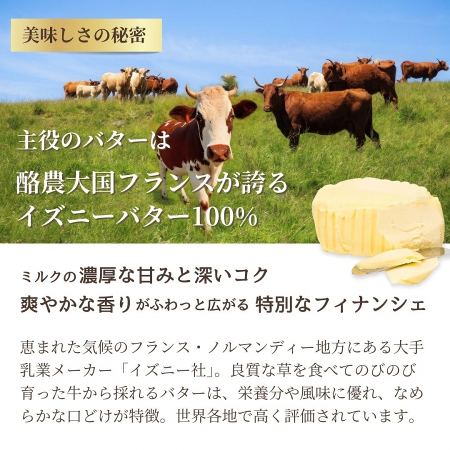 酪農大国フランスの中でも、特に恵まれた気候のノルマンディー地方「イズニー社」のバターを100%使用し、美味しさを追求したプレミアムなフィナンシェ。