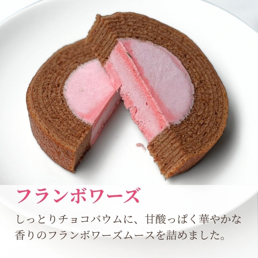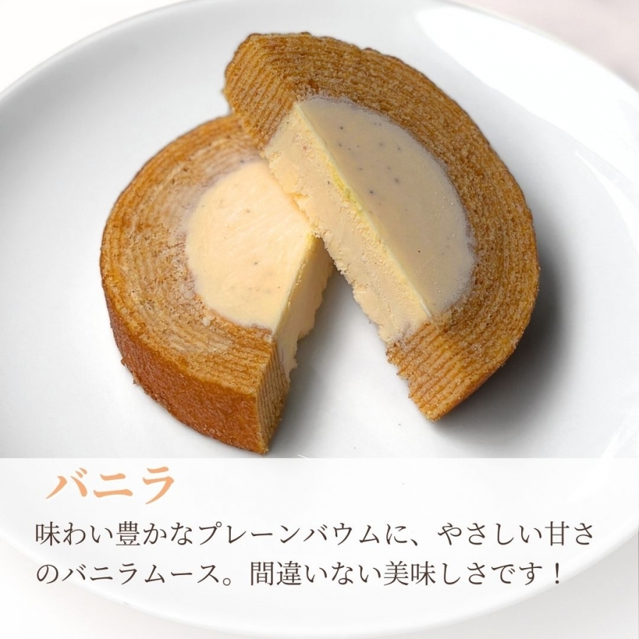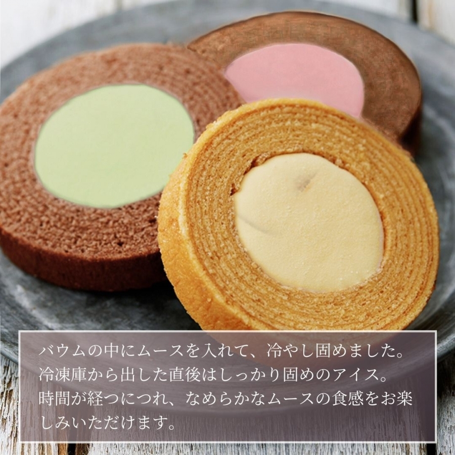 特製ムースを、しっとりとしたバウムクーヘン生地に詰めて冷やし固めました。