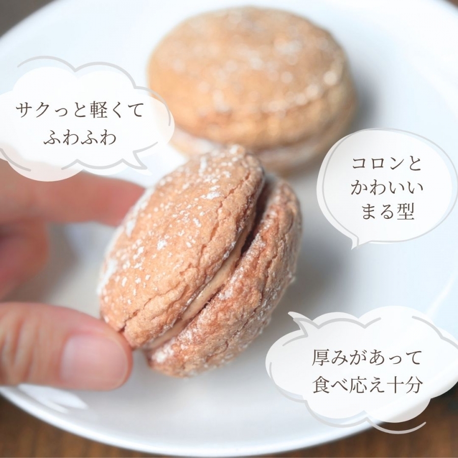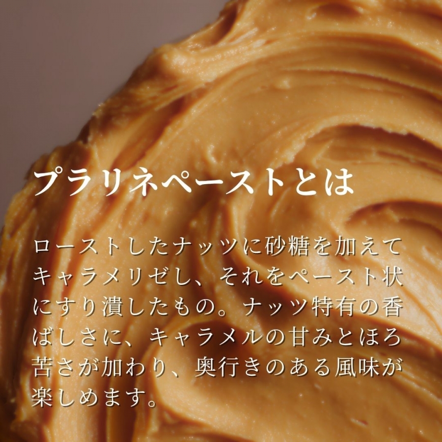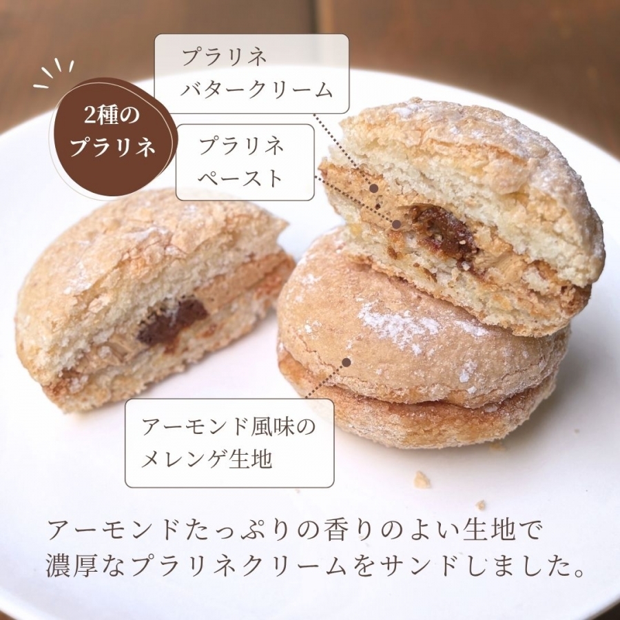 サクっと軽やかなアーモンド風味のメレンゲ生地に、香ばしいプラリネペーストとプラリネのバタークリームをサンドしました。