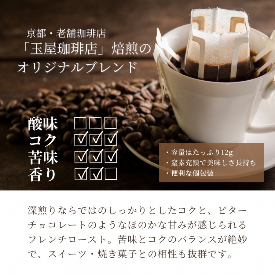 京都の老舗珈琲店「玉屋珈琲店」で焙煎されたフレンチローストのドリップコーヒー。