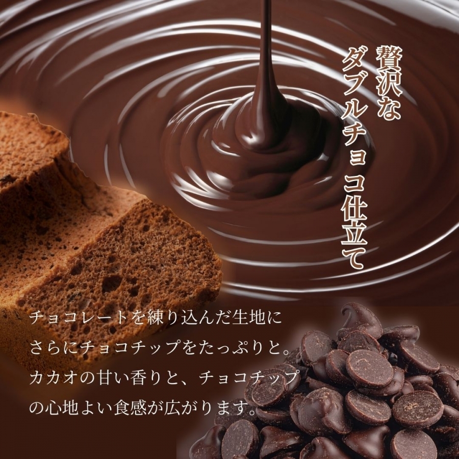 カカオの香りとザクザク楽しいチョコチップの食感を楽しめる、ダブルチョコ仕立てのシフォンです。
