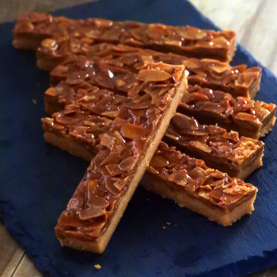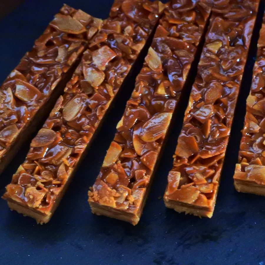 軽いサクサクのサブレと、はちみつや生クリームをじっくり煮詰めたキャラメルアーモンドを一緒に焼き上げたお菓子です。