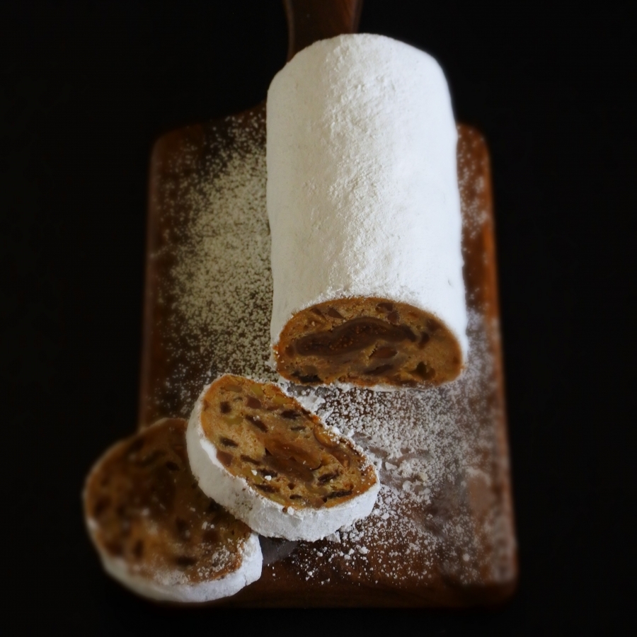 ドライフルーツやナッツがふんだんに入ったドイツの伝統的なクリスマスケーキ。