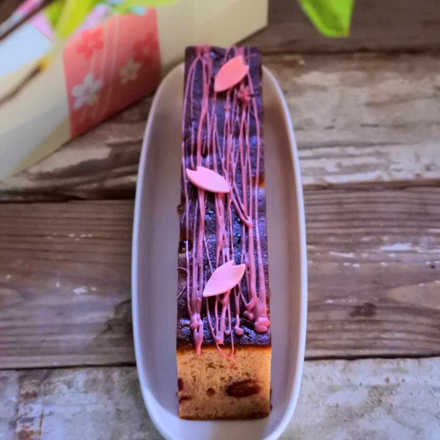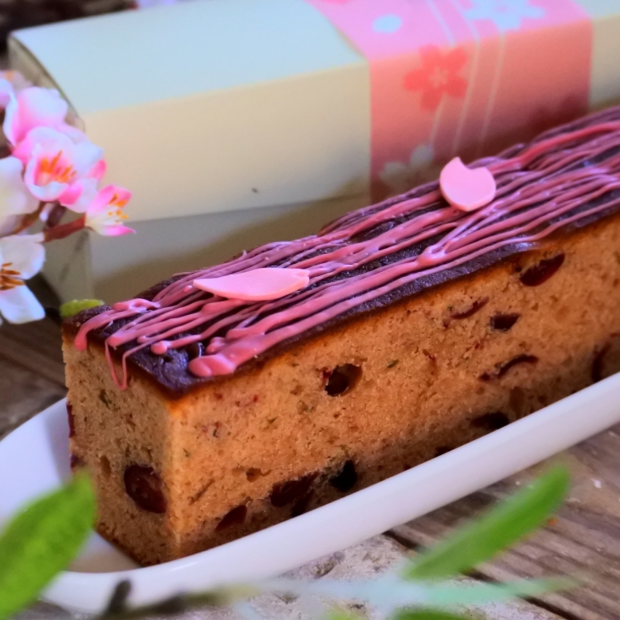 桜の花葉の塩漬けとクランベリーを生地身混ぜ込み、しっとり焼き上げた春限定のパウンドケーキです。
