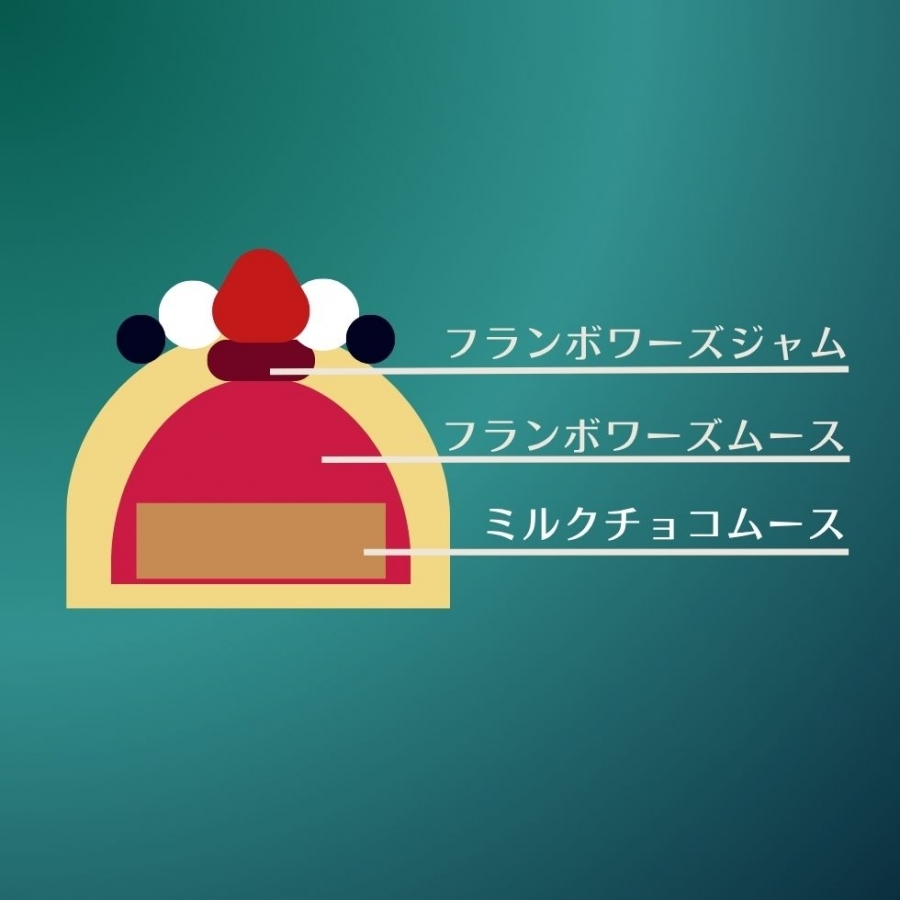甘酸っぱいフランボワーズムースと優しい甘さのミルクチョコムースのハーモニーをお楽しみいただけます。