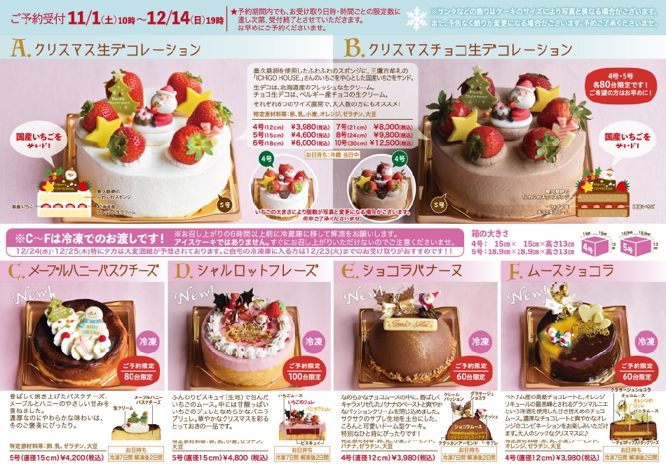2025年のクリスマスケーキのご予約は11/1(土)10時〜12/14(日)19時までとなります。