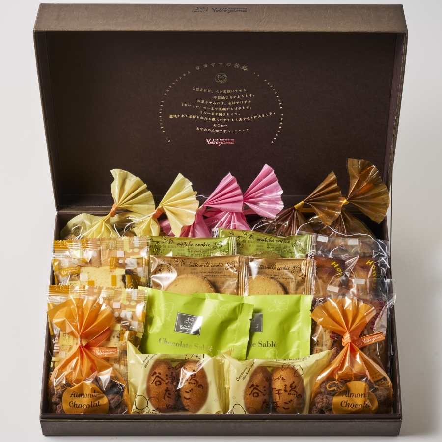 心菓だよりG::谷津干潟の卵、プレミアムガトーショコラ、フィナンシェハニー、フィナンシェアールグレー、フルーツケーキ、抹茶ケーキ、カラメルケーキ、バターミルククッキー、抹茶クッキー、チョコチップクッキー、チョコレートサブレ、アーモンドショコラの各2点ずつとアーモンドクッキー大、苺ミルククッキー大を各1点ずつの合計26点入りギフト