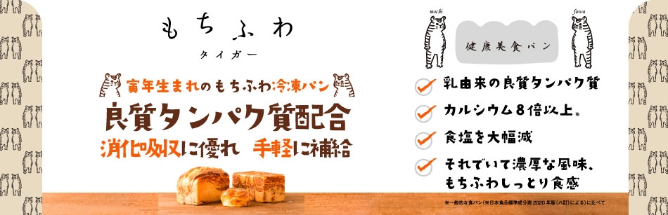 [もちふわタイガーとは]良質タンパク質をしっかり摂取 乳由来プロテインを手軽に補給 健康と身体づくりにおススメの食事パン 寅年生まれの驚きのもちふわ冷凍パン