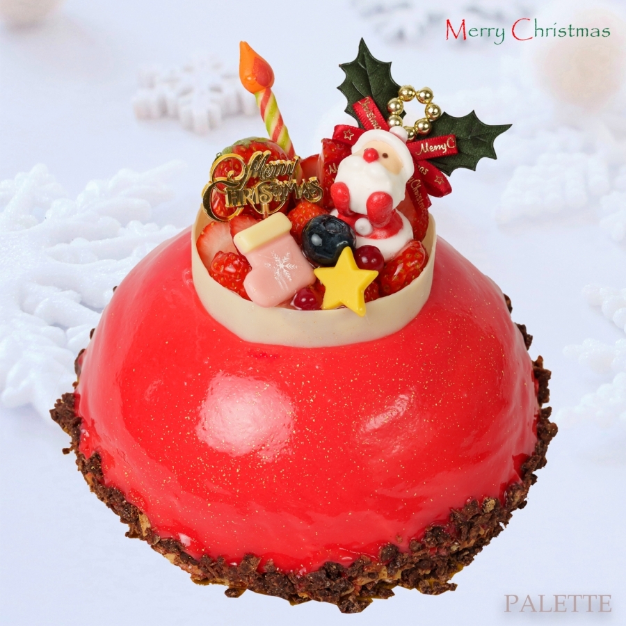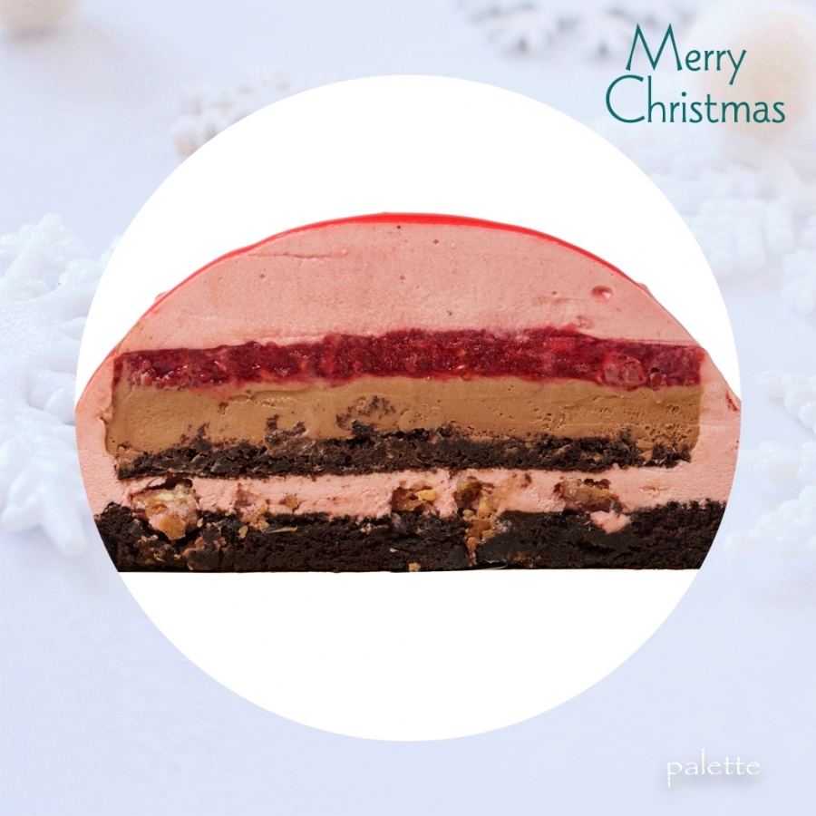 甘酸っぱいイチゴとフランボワーズのムースに、口どけなめらかなチョコレートムースが重なり合う、贅沢な二層仕立て。さらに、3種のベリーを使った果実のジュレが広がり、ひと口ごとにフレッシュな酸味と果実の香りが弾けます。香ばしいヘーゼルナッツと、サクサクのフィヤンティーヌにチョコレートをまとわせた層が、食感にリズムを添えて。華やかさとやさしさを兼ね備えた、聖夜にふさわしい特別なケーキです。大切な人とのひとときを、甘く彩る一品をどうぞ。