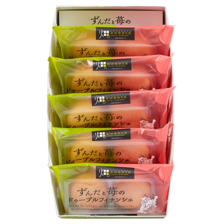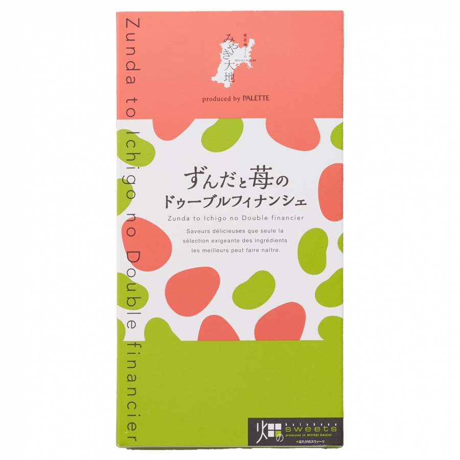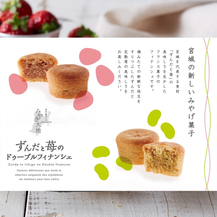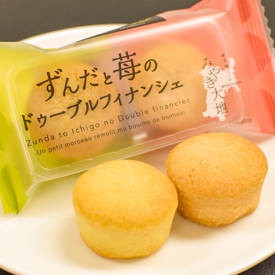 フィナンシェとはフランス発祥の焼き菓子の一種で、現在では広く一般に馴染みのあるお菓子とも言えるでしょう。そのフィナンシェに宮城の代表食材であるずんだと苺を合わせました。ずんだの程良い甘みと完熟苺の果肉感をお楽しみください。