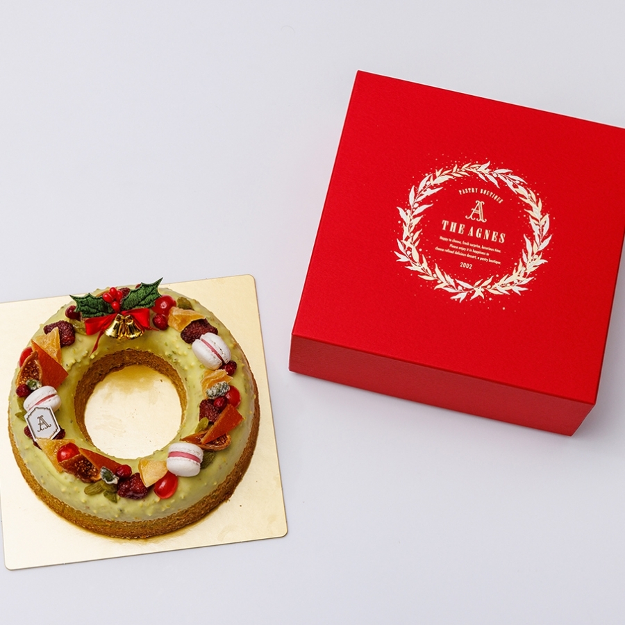 自家製いちごのドライフルーツとピスタチオをたっぷり練り込んだ生地を焼き上げ、色とりどりのドライフルーツやマカロンを飾り付け、ピスタチオ風味のチョコレートで仕上げた、季節限定クリスマスリース型の焼き菓子です。