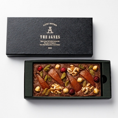 アグネスのタブレットショコラは、パティシエが厳選した豊かな風味とコクを生み出すチョコレートを使用し、色とりどりのドライフルーツやナッツを散りばめた、華やかなチョコレートです。