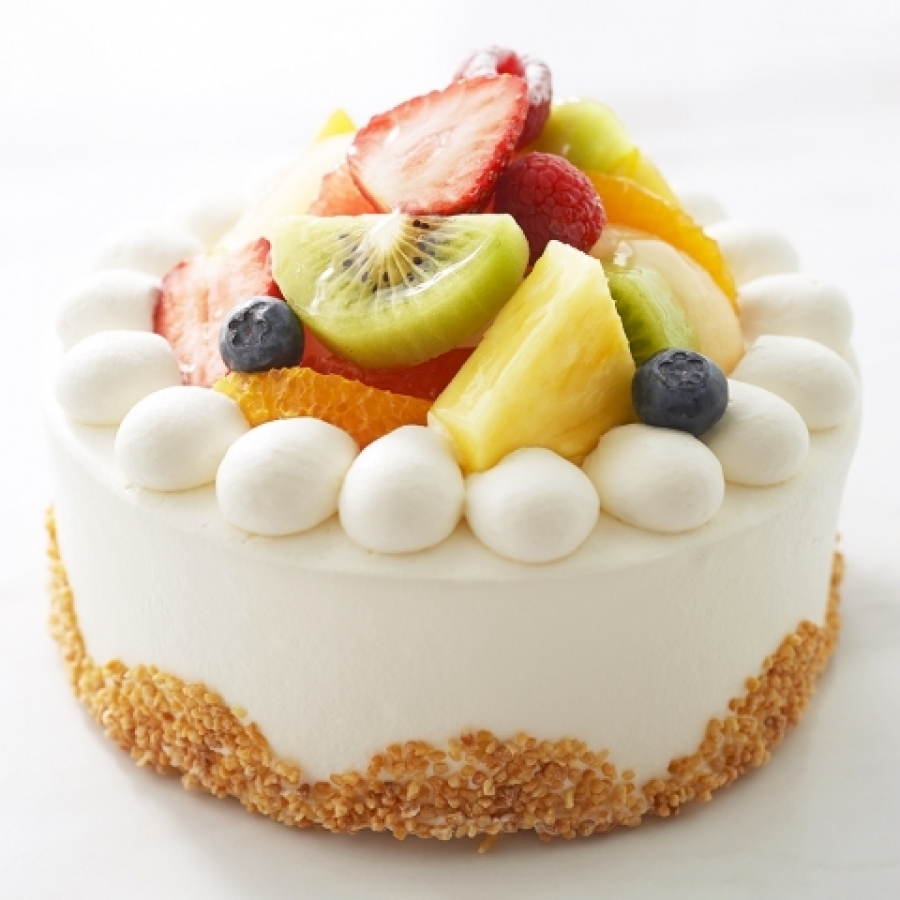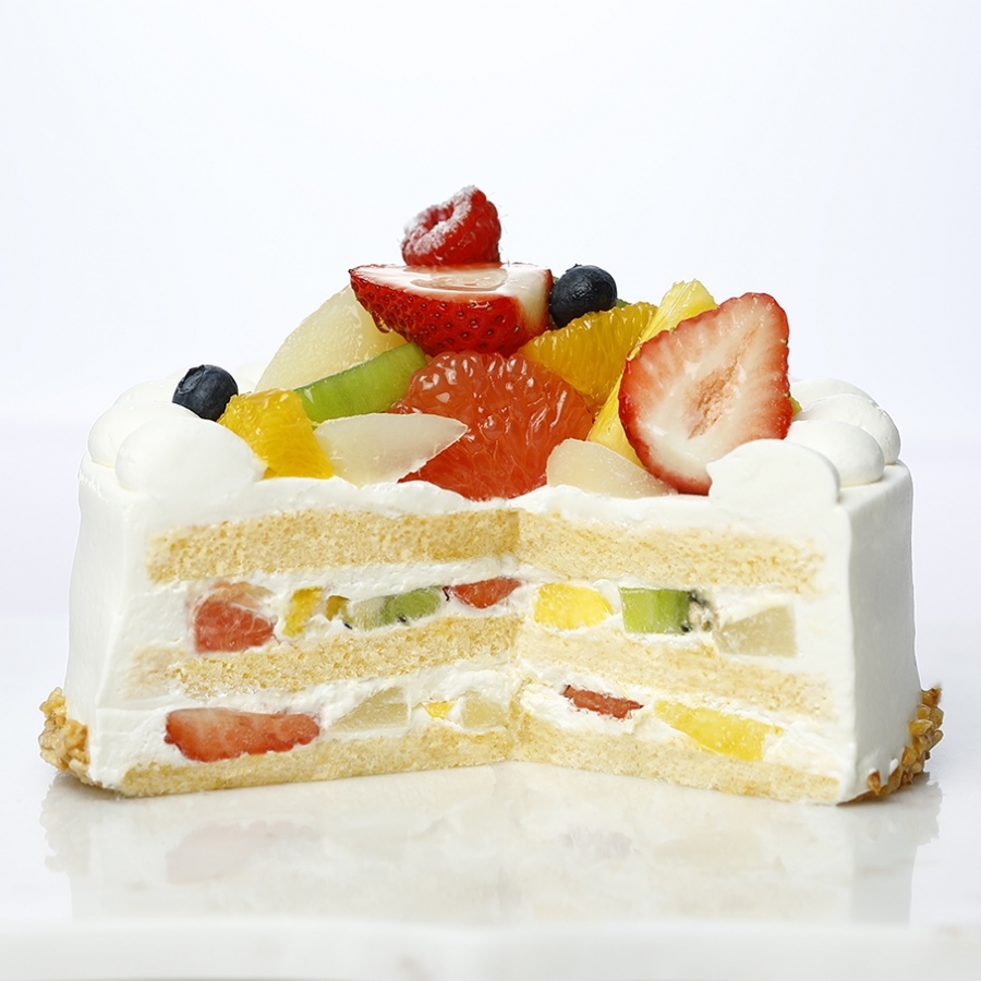 ふんわりしっとりと焼き上げたスポンジ生地にパッションフルーツとアプリコットのシロップを染み込ませ、色とりどりの季節のフルーツをたっぷりと使用し、彩りよく仕上げました。