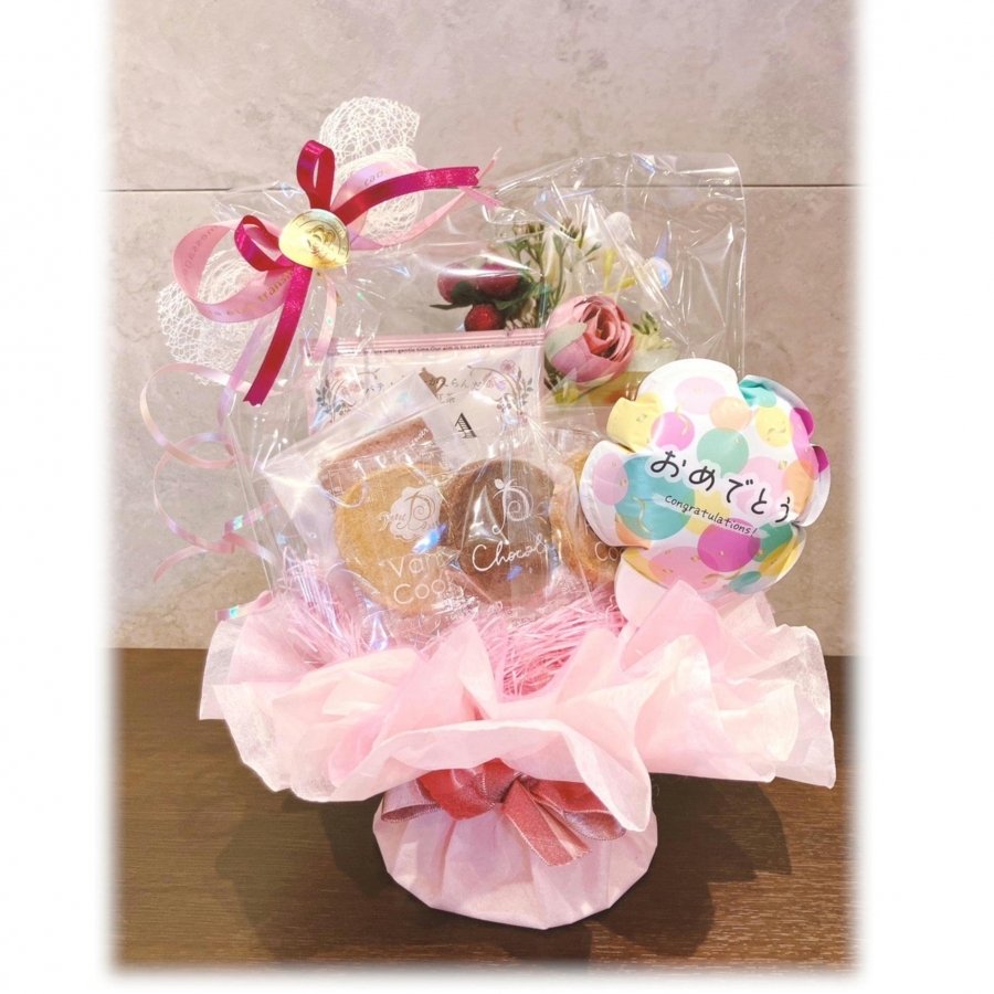 お洒落な造花に当店人気の焼き菓子と紅茶を添えて。