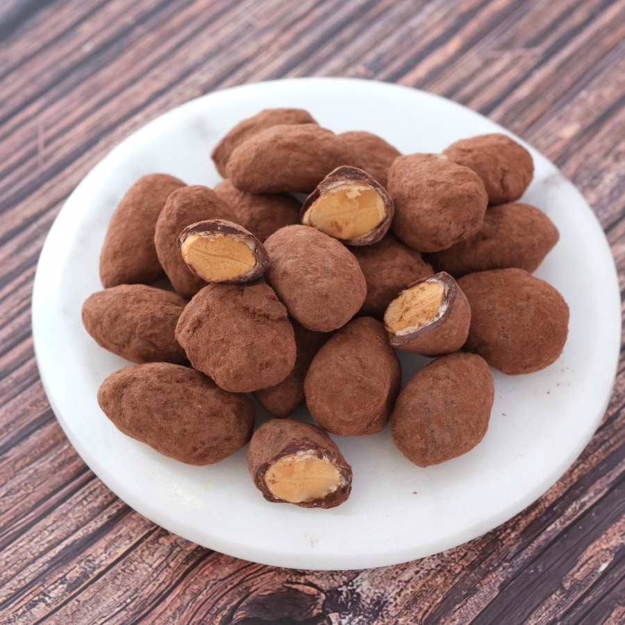 アーモンドをキャラメリゼし、チョコレートでコーティング。さらにココアをまぶしました。80g入り