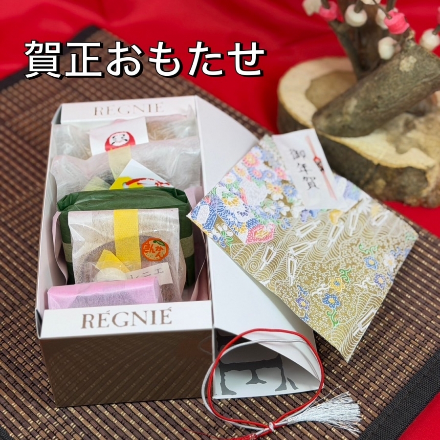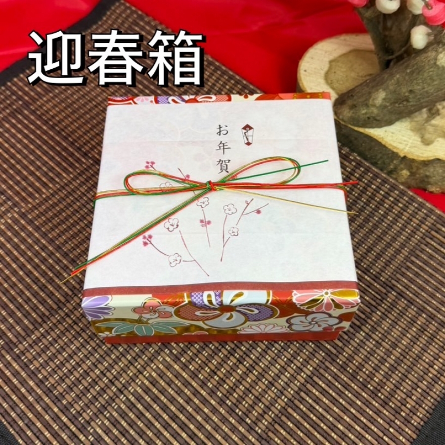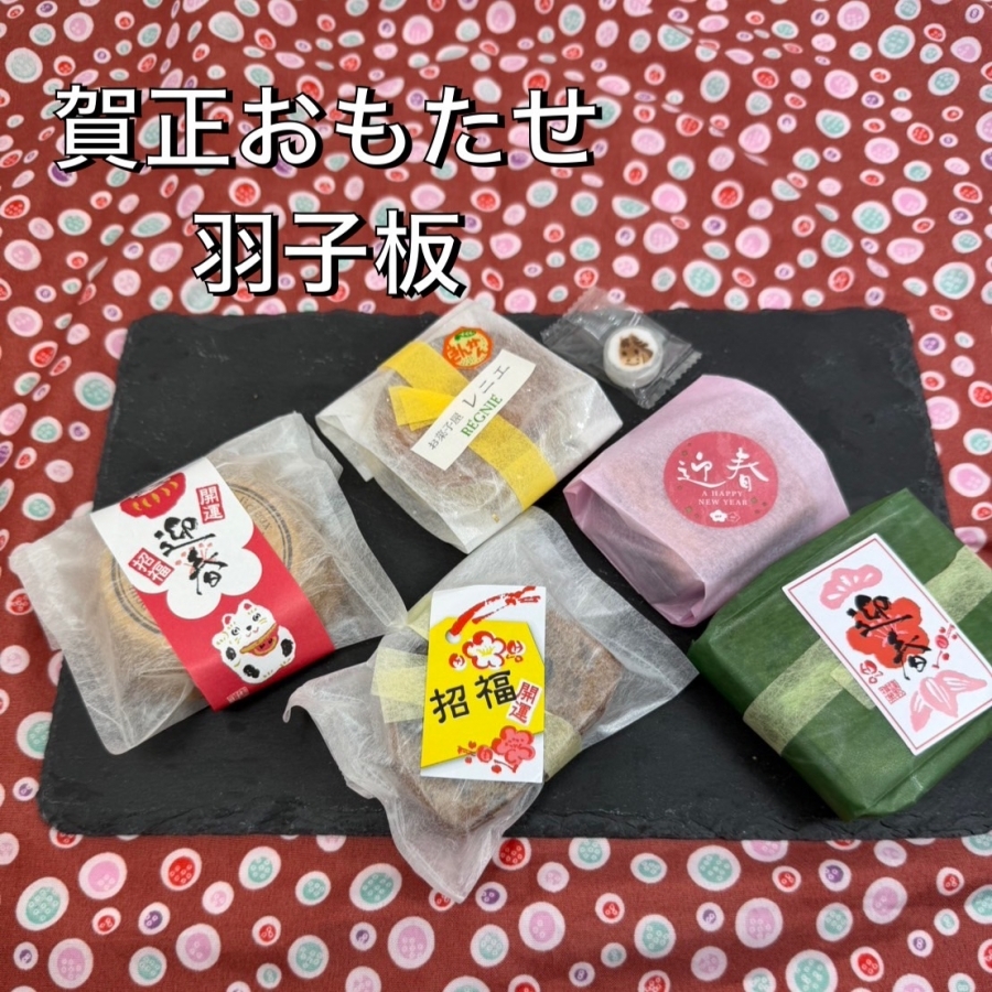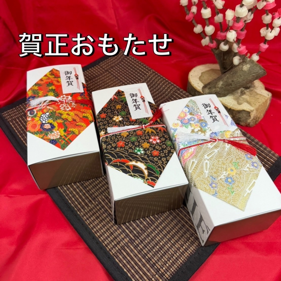 写真のパッケージでの発送でございます。(賀正おもたせの和柄はおまかせとさせていただきます)。