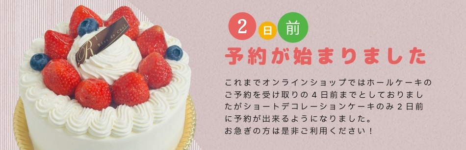 フルーツ増量やクリームの変更、特注ケーキのご予約は受け付けておりませんのでご来店またはお電話にてご予約くださいませ。