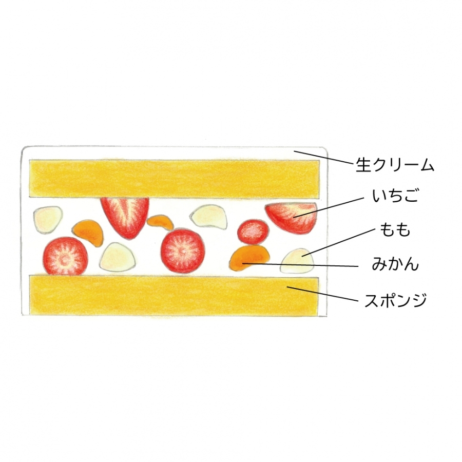 いちご・白桃・みかんをサンドし、ふわふわのスポンジが魅力です。