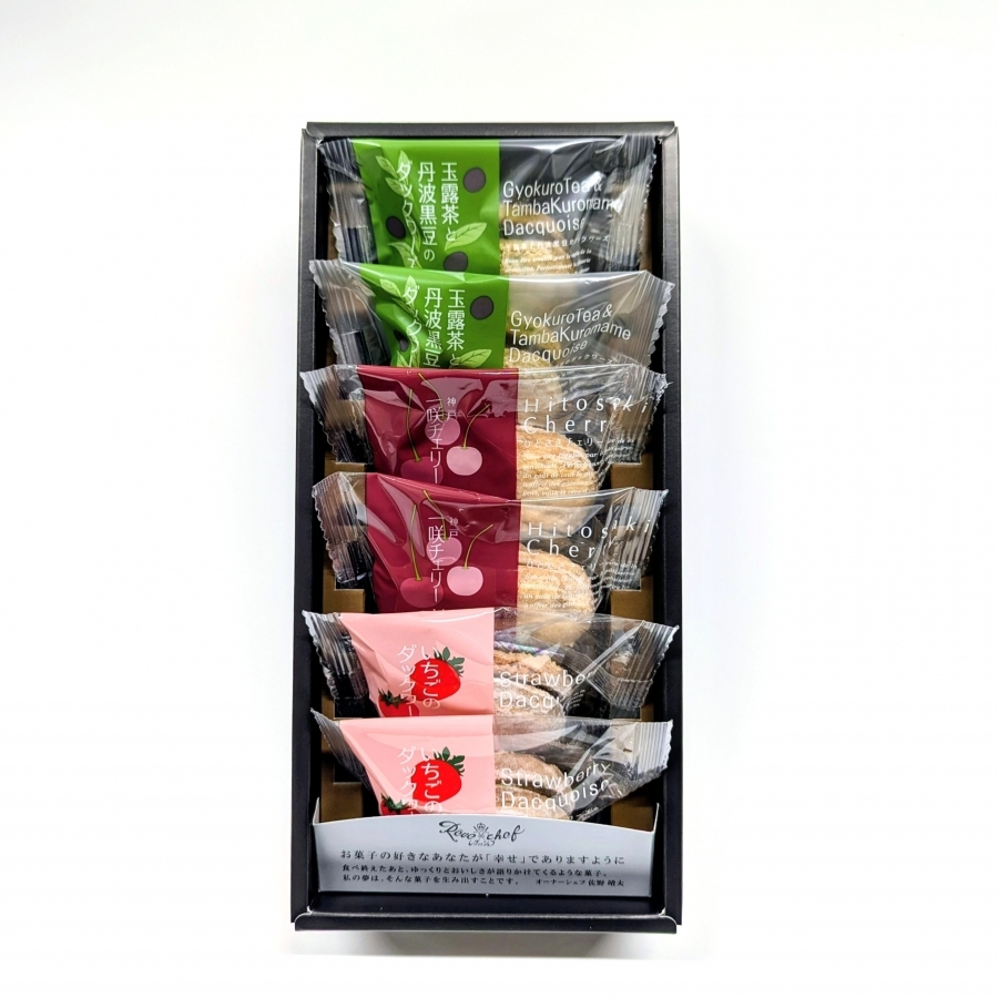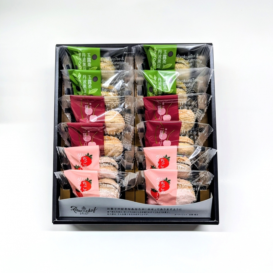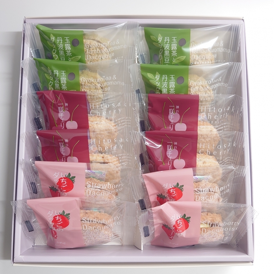 卵白(国産)、砂糖、黒豆、アーモンド、バター、小麦粉、抹茶、玉露、コーンスターチ、レモン果汁(一部に卵・小麦・乳成分・大豆・アーモンドを含む)
