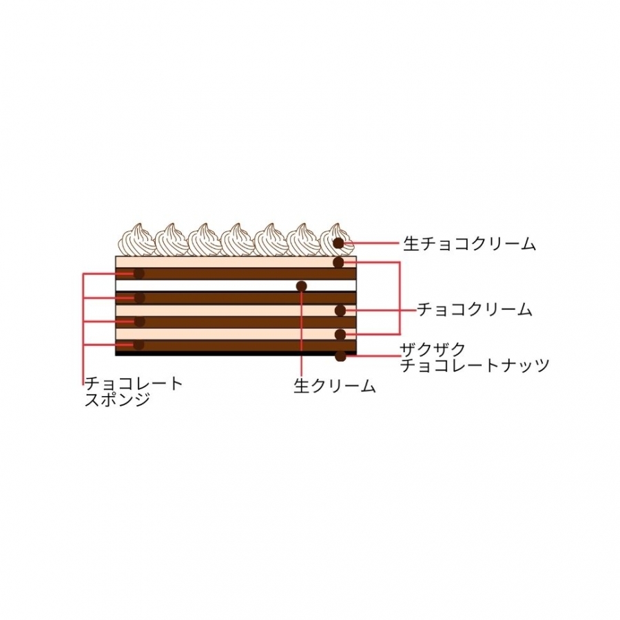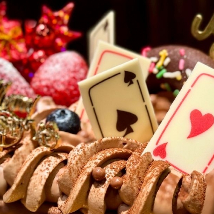 スペイン産チョコレートを使用。なめらかなチョコクリームと軽やかなスポンジを重ね、ザクザク食感のチョコナッツで仕上げました。半割ドーナツやトランプチョコを飾り、遊び心あふれるパーティー仕様に。