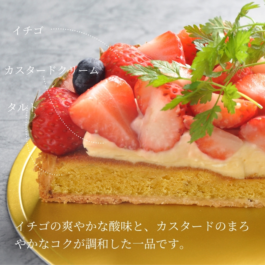 クレームダマンドで焼き上げたタルトにカスタードクリームを重ね、イチゴをたっぷりと乗せました。