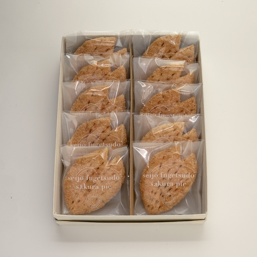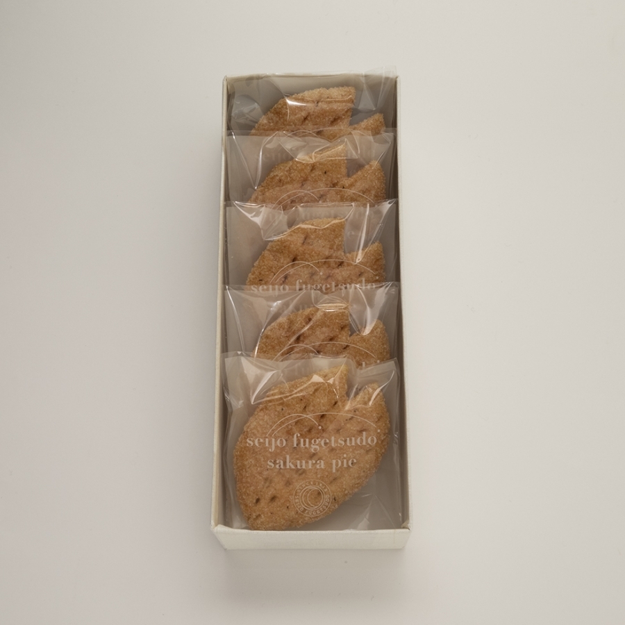 桜の葉の塩漬けを練り込み、桜の花とフランボワーズでほんのりピンクに色付けした、さくさくのリーフパイです。桜の散る頃までの期間限定商品です。