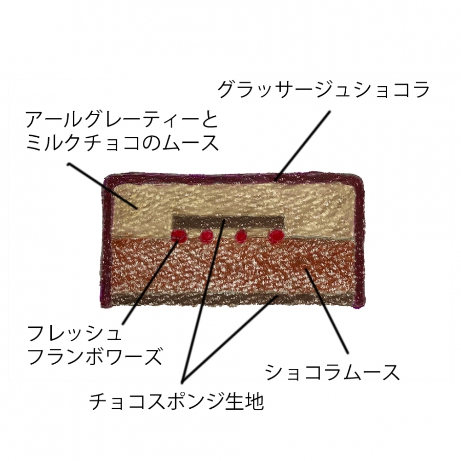 アールグレイとミルクチョコのムース、スイートチョコのムース、チョコスポンジを重ねたハート型のデコレーションケーキを、グラッサージュショコラで艶やかに仕上げました。